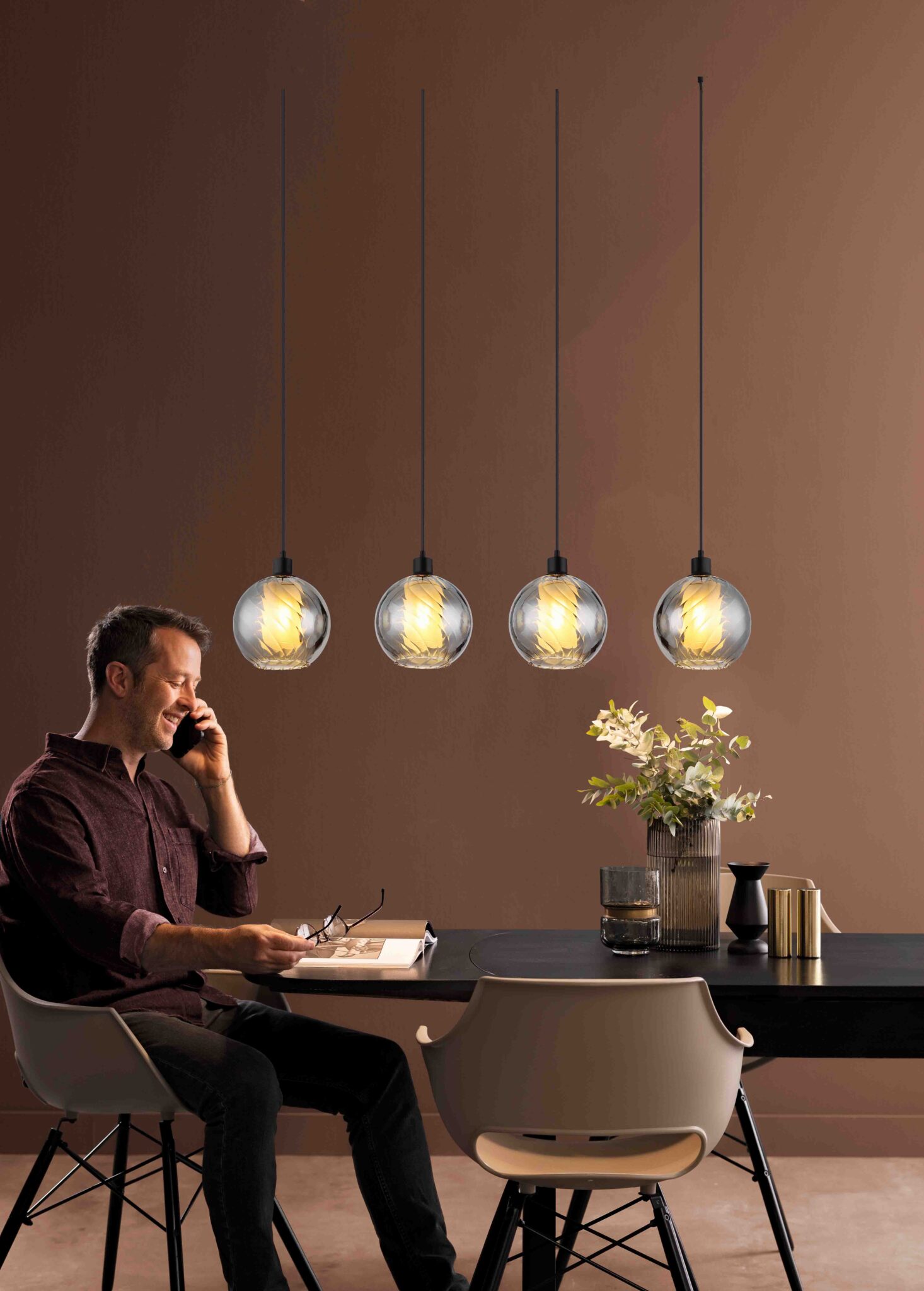 Metall schwarz matt, Glaskugeln rauchfarben, Opalglas innen, 4x E27 max. 25W, B/H/L ca. 20/120/110 cm, ohne Leuchtmittel. Abgebildete Leuchtmittel nur Dekoration.