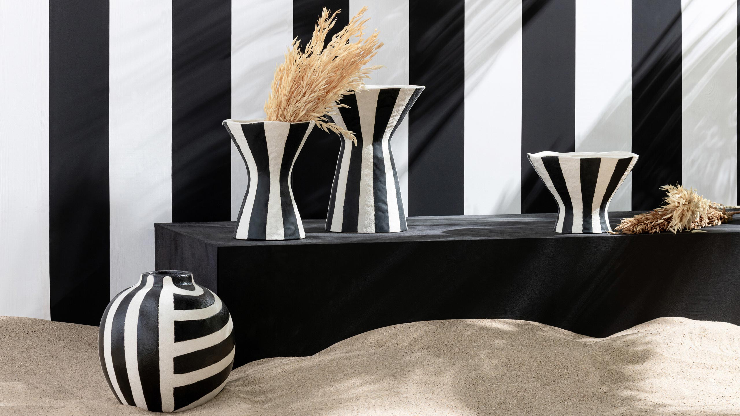 Ein modernes Streifenmuster in Schwarz-Weiß erscheinen diese Jolipa Vasen aus Steingut.