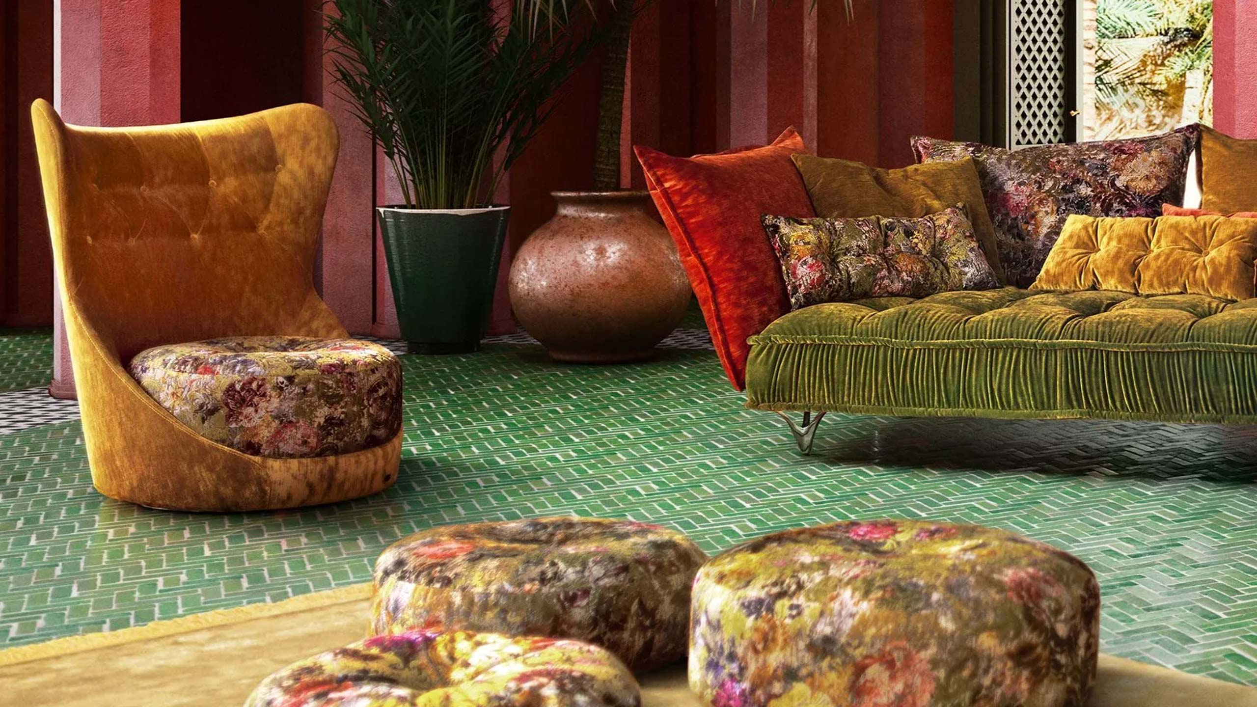 Zu Blumenmotiven kombinieren wir Samtmöbel. Das edle Material passt hervorragend zum Mustertrend und lässt es elegant und luxuriös wirken.