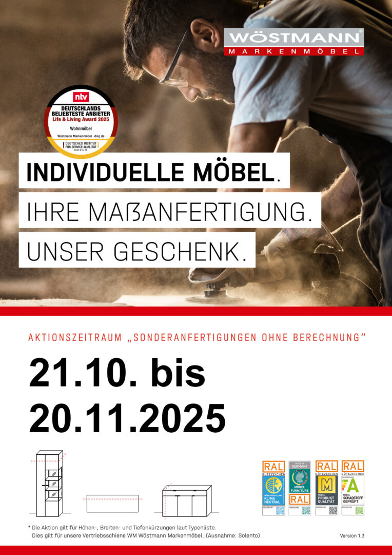 Gestalten Sie Ihre Möbel ganz nach Ihren Vorstellungen – und das ohne Aufpreis! Im Aktionszeitraum vom 21. Oktober bis 21. November 2025 bieten wir Ihnen bei WM Wöstmann Markenmöbel und SZ Wöstmann Schlafraumsysteme (Ausnahme: Solento) kostenfreie Sonderanfertigungen. Profitieren Sie von Höhen-, Breiten- und Tiefenkürzungen laut Typenliste – ganz individuell und ohne zusätzliche Kosten.